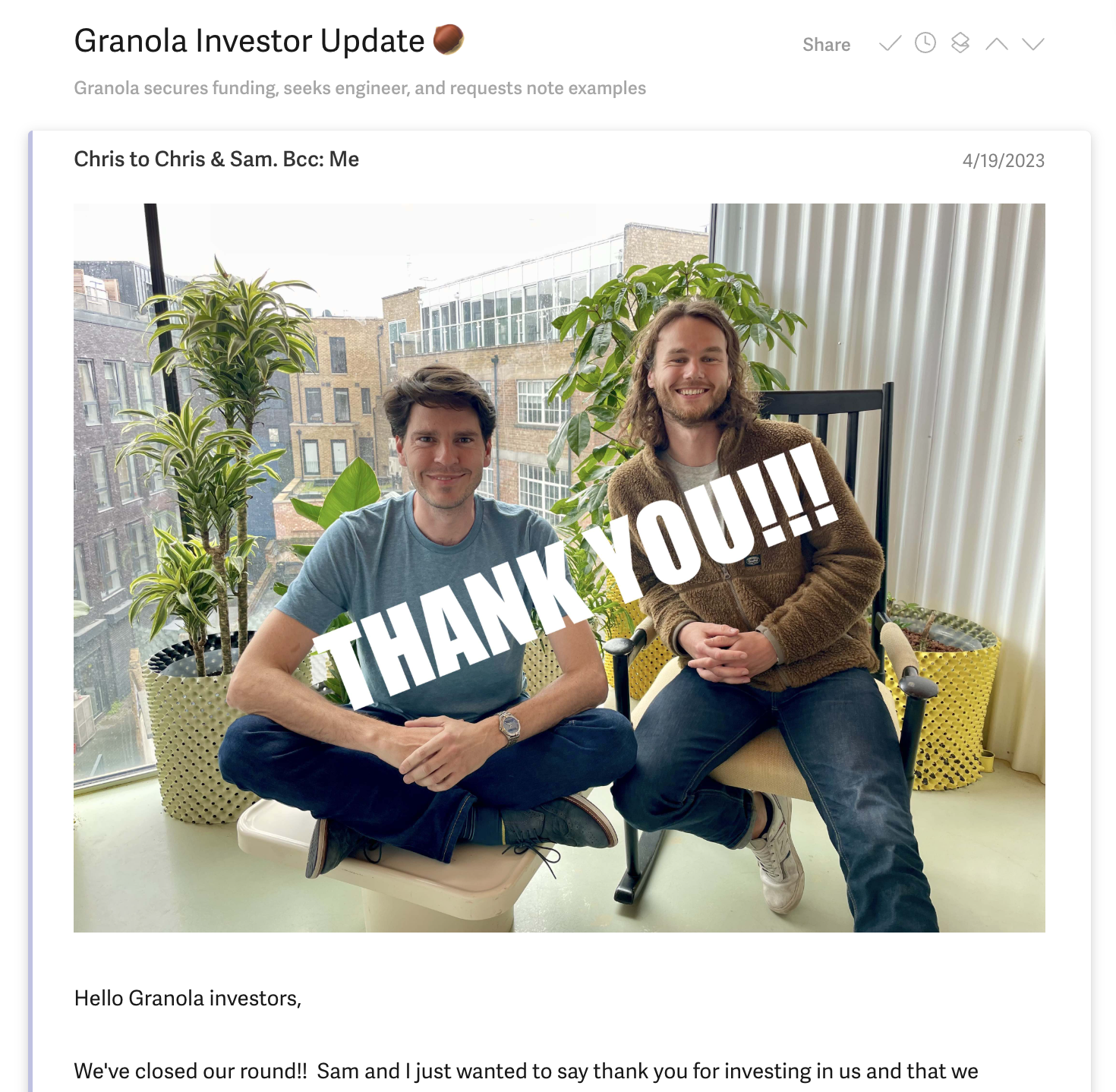 We spent quite some time discussing what would have to be true in order for Granola to be a billion dollar business. There were a few, all of which felt realistic and achievable by such a talented team.