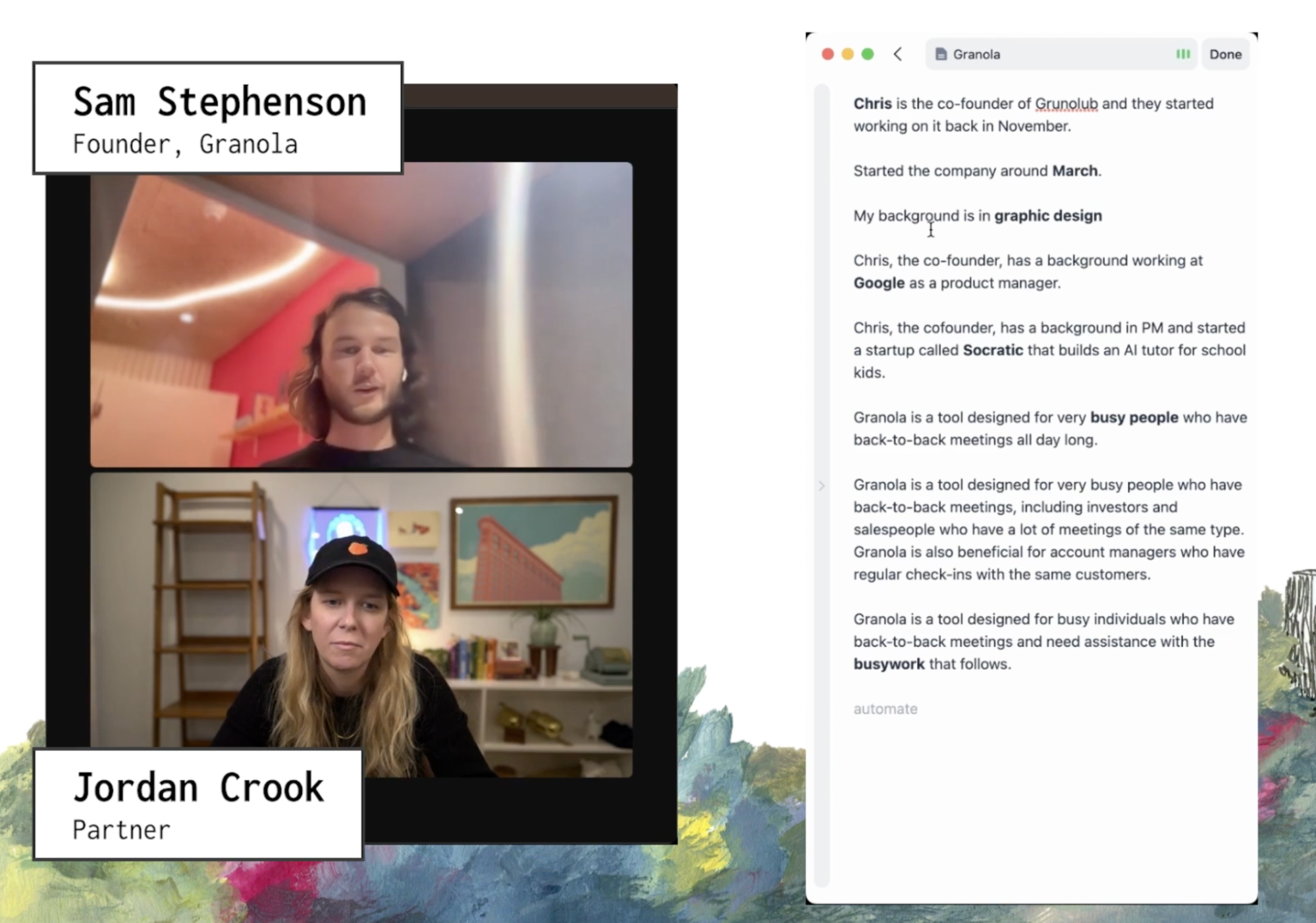 The former was undoubtedly true, all the way back during the time of investment. The latter was the plan, though initially Granola launched with Google Workspace integration. Chris and Sam always knew that they’d eventually have to launch for Windows, integrate with MSFT products as well as Google, and ultimately be available on both iOS and Android.